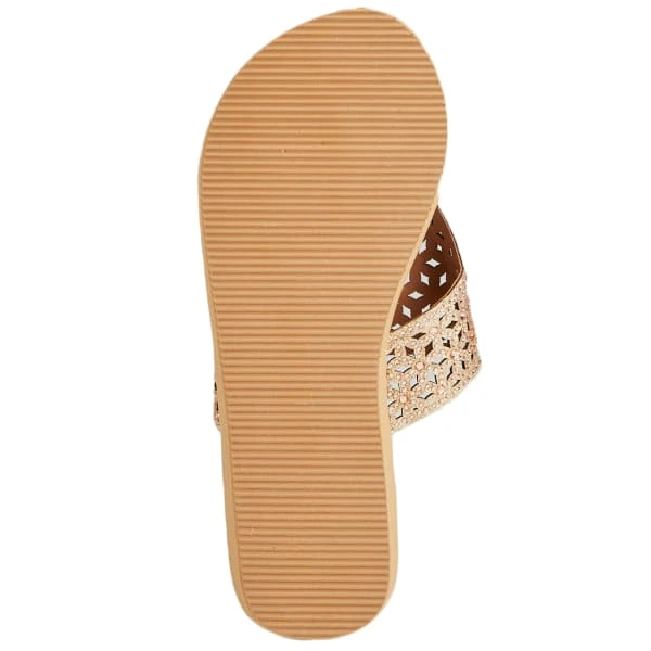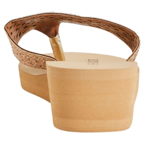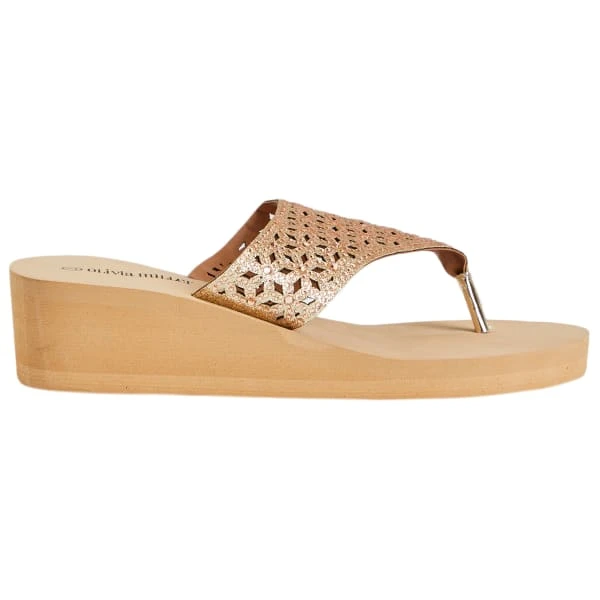 These Olivia Miller wedge sandals feature a fashionable upper, between-the-toe thong design, and an elevated heel.