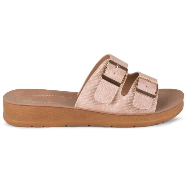 - Slip on sandal with double buckle shimmer detail.