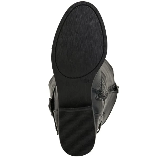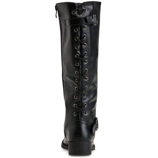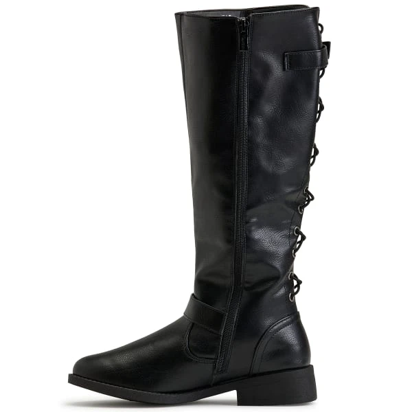 The Lady Luck knee high riding boot features a faux leather upper and decorative lace-up back. Pair with jeans for a sharp look on any occassion.